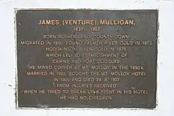 Sacred to the memory of James Venture Mulligan, prospector and explorer, died at Mount Molloy aged 69 years. RIP. Erected by a few old friends.[16]