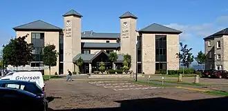 The James Watt Memorial College on the corner of William Street and Dalrymple Street was officially opened as the Watt Memorial Engineering and Navigation School on 1 June 1908. The building was constructed near the site of James Watt's birthplace (which was on the other side of William Street) and was built with funds donated by another famous Scot, Andrew Carnegie, who performed the opening ceremony, unveiling a statue of James Watt that stands prominently in the angle formed at the corner tower. H & D Barclay of Glasgow designed the original red sandstone building in a heavily ornamented Scottish baronial style, The corner is marked by an L-plan tower, the wing to William Street being capped by a crow step gable while the north wing has a conical roofed tower above a balustrade. The Dalrymple Street facade faces north out onto the main A8 road to Glasgow and is capped by a steep sloping roof up to an iron balustrade which protects a flat roof originally used to allow navigation students to take observations of the sun. The west corner features a corbelled corner turret with a conical roof. A later extension in William Street to the south of the tower is in a plainer more modern style. The building is now in use by Inverclyde Council local authority education department as office accommodation.[1]