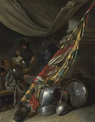 He was specialized in 'guardroom scenes', a type of genre scene that had become popular in the mid-17th century, particularly in the Dutch Republic. In Flanders there were also a few practitioners of the genre including David Teniers the Younger, Abraham Teniers, Tijssens' master Anton Goubau, Cornelis Mahu and Gillis van Tilborch. A guard room scene typically depicts an interior scene with officers and soldiers engaged in merrymaking. Guardroom scenes often included mercenaries and prostitutes dividing booty, harassing captives or indulging in other forms of reprehensible activities.[7] Tilborch painted a Guardroom Interior with Armour and a Standard Behind (sold at Sotheby's on 10 July 2004 in London, lot 172), which depicts two soldiers and a woman drinking and smoking in a room. The soldiers are almost completely hidden behind a pile of weapons and a war standard. In its general arrangement and specific details such as the figures and the armour on the floor the painting is based on the signed composition of Tijssens' master Anton Goubau in the National Gallery in Prague. The Goubau painting continues to the left into a horizontal composition. It is likely that Tijssens' painting was cut down as on the extreme left margin the nose, moustache and chin of the figure next to the woman are visible. The original painting may therefore have been similar in composition to that of Goubau.[8] The armour depicted in the picture was already out of date at the time it was painted since metal armours, breast plates and helmets fell out of use from the 1620s.[9] It is possible that in line with the moralizing intent of the genre, the armour is a reference to the vanitas motif of the transience of power and fame.[10]