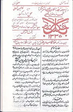 The periodical Jangal (Persian: جنگل, lit.'Forest'; DMG: Ǧangal) was founded in 1917 by the Nehzat-e Jangal (“Jangali-movement“, 1914–1921) in Gilan, Iran.[1] Mirza Kuchak Khan (1880/1882–December 1921), a young revolutionary and the founder and leader of this movement was fighting together with the Ettehad-e Eslam committee (“Islamic Unity“) in the forests of Northern Iran. Their movement was directed against – among others – large landowners as well as the exertion of influence coming from the British and Tsarist Russia. In June 1920, the Jangalis joined forces with the Communist Party of Iran and proclaimed the Socialist Republic of Gilan, which was re-conquered by Reza Khan Pahlavi (later: Reza Shah Pahlavi) in November 1921.[2] The journal was the mouthpiece of the Jangalis and partially published by Mirza Hoseyn Kasma’i (1862–1921). They spread their opinion and critique in 31 issues by means of literary texts and cultural symbolism.[3] They had many ideas in common with the nationalism of state elites: aspiring the compatibility of Islam, Iranian nationalism and socialism.[4]