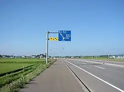 National Route 12 is a 135.7-kilometer-long (84.3 mi) highway in western Hokkaido that runs north from Sapporo to Asahikawa. Its southern terminus lies at an intersection in Chūō-ku, Sapporo where it meets National Routes 36 and 230. Along the way from Sapporo to Asahikawa, it passes through the cities of Ebetsu, Iwamizawa, Takikawa, and Fukagawa.[2] The highway is closely paralleled by the tolled Dō-Ō Expressway and it functions as free alternative route to the expressway between Sapporo and Asahikawa.[3] A notable section of the highway between the cities of Bibai and Takikawa is known for being the longest straight section of roadway in Japan.[4] Marked as being 29.2 kilometers (18.1 mi) long, there is actually a slight curve in Takikawa, bringing the actual length of the straight section of the road down to 27.7 kilometers (17.2 mi).[4] Its northern terminus in Asahikawa is the intersection where it meets National Routes 39 and 40.[5]