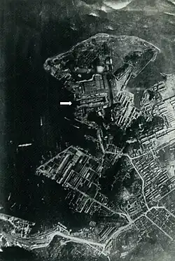As with Shinano's half-sisters Yamato and Musashi, the new ship's existence was kept a closely guarded secret. A tall fence was erected on three sides of the graving dock, and those working on the conversion were confined to the yard compound. Serious punishment—up to and including death—awaited any worker who mentioned the new ship. As a result, Shinano was the only major warship built in the 20th century that was never officially photographed during its construction. The ship is only known to have been photographed on three occasions. The first photograph, taken by a Japanese aircraft in mid-October 1944, was intended to review the camouflage efforts made to conceal the carrier while in drydock.[5][6] Later, on 1 November 1944, a Boeing B-29 Superfortress reconnaissance aircraft captured Shinano near the entrance of Yokosuka Harbor from an altitude of 9,800 meters (32,000 ft). Ten days later a civilian photographer aboard a harbor tug photographed Shinano's initial sea trials in Tokyo Bay.[1]