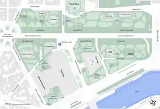 The Jardins des Champs-Élysées is a public park located in the 8th arrondissement of Paris. It occupies 13.7 hectares, and is located on both sides of the Avenue des Champs-Élysées between the Place de la Concorde on the east and the Rond-point des Champs-Élysées on the west and between Avenue Gabriel to the north and the Seine to the south. It includes within its boundaries the Grand Palais and the Petit Palais, as well as a theater and other buildings. It was one of the first parks in the city, laid out by André Le Notre in 1667, and was the site of the Paris International Exposition of 1855 and an important part of the Paris Universal Exposition of 1900, for which the Grand Palais and Petit Palais were created.