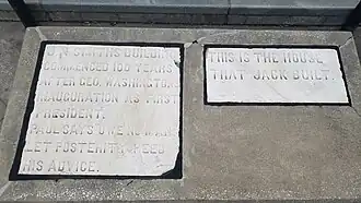 In 1889, Smith built a large commercial building at the intersection of Peachtree Street and Forsyth Street. The building, called "The House That Jack Built", was constructed of granite blocks that had proven unusable for street paving purposes and adorned with marble slabs that had different phrases and sayings, including many Biblical verses.[6] When Smith leased the building and property in 1909, he stipulated that the inscribed slabs should be displayed prominently in any future building or structure built on the property.[7] When MARTA built the Peachtree Center station on the property in 1982, they relocated two of the slabs to a fenced-off area near the subway station entrance, where they still lie.[6]