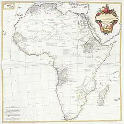 Jean-Baptiste Bourguignon d'Anville (French pronunciation: [ʒɑ̃ batist buʁgiɲɔ̃ dɑ̃vil]; born in Paris 11 July 1697 – 28 January 1782) was a French geographer and cartographer who greatly improved the standards of map-making. D'Anville became cartographer to the king, who purchased his cartographic materials, the largest collection in France. He made more than 200 maps during his lifetime, which are characterized by a careful, accurate work largely based on original research. In particular, D'Anville left unknown areas of continents blank and noted doubtful information as such, contrary to the lavish maps of his predecessors.[1] His maps remained the reference point in cartography throughout the 19th century and were used by numerous explorers and travellers.[2]