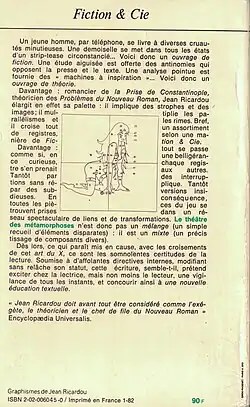 - ^ a b Lynn A. Higgins, Parables of Theory - Jean Ricardou's Metafiction, Summa Publications Inc., Birmingham, Alabama, 1984, pp. 93 sq