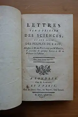 - Lettres sur l'origine des sciences et sur celle des peuples de l'Asie : adressées à M. de Voltaire / par M. Bailly, et précédées de quelques lettres de M. de Voltaire à l'auteur. 1777 Archived 20 April 2021 at the Wayback Machine