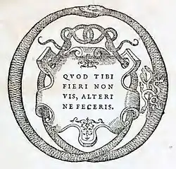 The emblem of the de Tournes press was two entwined vipers. Their mottoes included Nescit labi virtus; Son art en Dieu; Quod tibi fieri non-vis, alteri ne feceris and Virum de mille unum reperi.[1]