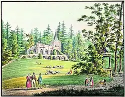 The large estate park was created after 1822 to instructions of princess Marianne. The arrangement referred to the family of the owners. A bench of marble showed medallions of the prince, the princess and its children, a neo-Gothic monument commemorated to a brother of princess Marianne and the Waldemarsturm housed a weapons collection of Prince Waldemar. But also cottages, a greenhouse, a cross on the summit by Christian Daniel Rauch and many other buildings and structures were erected. Today the park is barely visible and most of its buildings are destroyed.