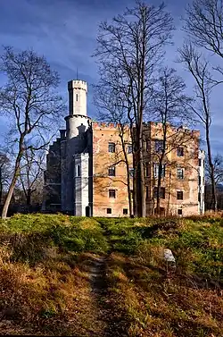 Karpniki palace (German: Schloss Fischbach), the summer palace of Prince Wilhelm of Prussia, is one of the best-known palaces in the valley. It was first mentioned in 1364 as a moated castle, which was expanded in the 15th century. Initially owned by the families Predel and Reichenbach, it was bought by Hans I. Schoff in 1476, who enlarged the castle with a two-storied mansion. After a fire in 1593, the building was again expanded with two new wings in Renaissance style. In 1822 prince Wilhelm acquired Fischbach, which became the first summer palace of the Hohenzollern dynasty in the valley. Beginning from 1844 it was reconstructed in neo-Gothic style according to plans in part by the prince himself. Wilhelm and his successors also equipped the palace with a remarkable art collection of medieval glass paintings and far eastern objects of art. At the end of World War II, it was used as a depository for important art treasures from Silesia and the national library in Berlin.