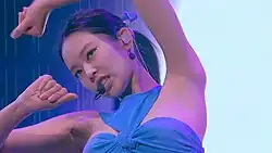 Jennie, instrumental in Blackpink's fashion image, has been nicknamed "Human Gucci" and "Human Chanel".[193] Her style portfolio ranges from Gucci and Saint Laurent to niche labels such as Marine Serre and Richard Quinn.[194] Jennie's sense of fashion earned her invitations to fashion events such as Saint Laurent's Summer 17 Collection Launch Party by Anthony Vaccarello,[195] Chanel's Mademoiselle Privé exhibition,[196] and Prada's Comics Collection Launch Party.[197] Chanel chose her as House Ambassador after noting her ripple commercial impact.[193] The hairpins Jennie wore in a five-by-five partition during her performances of her debut single "Solo" instantly trended in South Korea and were referred to as "Jennie's hairpins".[198][199][200]