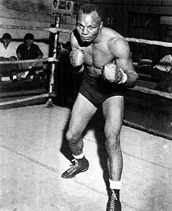 After this first victory, Walcott fought on and off throughout the rest of the decade (Walcott lacked professional management and a regular training routine, causing him to struggle during his early career).[6] Although he defeated a young Elmer Ray, he lost two bouts to Tiger Jack Fox and was knocked out by heavyweight contender Abe Simon in 1940. After losing to Simon, Walcott was inactive for over four years. During World War II, Walcott secured a wartime job, and did not fight again until 1944, winning two matches against local fighters Felix Del Paoli[7] and Ellis Singleton.[8]