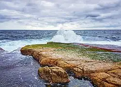 Waves crashing over Moes Rock at Jervis Bay Marine Park