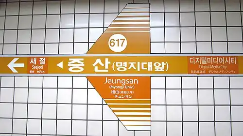 Jeungsan Station is a railway station on Line 6 of the Seoul Subway. Its alternative name is Myongji University Station due to the proximity to Myongji University.[1][2]