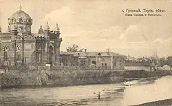 In 1893, large oil deposits were discovered in Grozny, leading to the rapid development of the city. Ashkenazi Jews from central Russia began to arrive in Grozny. The first prayer house was built in 1875, and in 1902 it was replaced by a large domed synagogue, built of brick, located between the Persian mosque and the Mitnikov bathhouse. As of 1883, Grozny had two synagogues.[8] The Ashkenazi synagogue was built in 1863, and the one for Mountain Jews in 1865.[6] Around 1928, by decision of the Soviet government, the synagogue was closed during the period of religious persecution. Later, the synagogue building was occupied by a music school.[9]