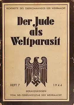 Through this comparison with parasites, pests and diseases the Jews were systematically denied to be human beings. Nazi propaganda was able to tie in here with the medieval image of the Jew as a well poisoner. However, these comparisons became much more important as a result of the more widespread knowledge of medicine and hygiene in the 20th century.[75] The only solution that remained in this logic was the physical extermination of the alleged pests, the Holocaust.[76] In the Nazi training literature, this consequence was repeatedly openly addressed. For example, in "Training Foundations for the Reich Themes of the NSDAP for the Year 1941/42" it was stated that a body infested with bacteria had to overcome these parasites, or it was overcome by them. He then had to take care to prevent a new infection in the future. This is also the case in people's lives: