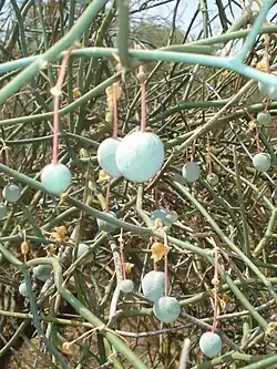 The karir bush (Capparis aphylla) grows alongside the jal throughout the district.[5] Like the jal, it is especially common in the Kachhi and Bar regions.[5] Sheep and goats readily graze off the karir, and cows will do so as well when other food is hard to come by.[5] It has a pinkish-white flower called the bata, as well as a berry called the dehla.[5] The dehla is eaten when ripe, but not extensively, and it is nowhere near as esteemed as ber or pilu fruit.[5] The unripe berries are pickled or made into a tonic for horses.[5] Karir wood is less susceptible (but not immune) to infestation by white ants than other types of wood found in the district; it gets used to make rafters for houses.[5]