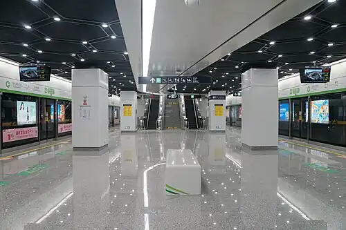 The station's interior design is themed "Soaring Eagle in Action" (Chinese: “飞鹰出击”), drawing inspiration from the shapes of aircraft fuselages and wings. Curved lines representing flight paths are integrated throughout the station's space, extending from the ceiling to the walls and floors, creating a cohesive artistic spatial effect.[3]