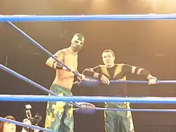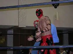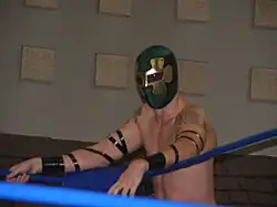 Jigsaw made his Chikara debut in late 2002, forming a rudo tag team named The Conundrum with Rorschach, while also occasionally teaming with Eddie Kingston and BlackJack Marciano as a member of The Toxic Trio.[4] On May 22, 2004, at Aniversario 3: Dodging the Sophomore Jinx The Toxic Trio faced Mike Quackenbush, Gran Akuma and Icarus in an Ultimate Jeopardy match. During the match, which The Toxic Trio lost, Kingston and Marciano turned on Jigsaw, effectively turning him into a tecnico.[8] In July 2004, Jigsaw reached the finals of Chikara's Young Lions Cup tournament, but was defeated by Larry Sweeney after outside interference from Rorschach, who then joined Sweeney's Sweet 'n' Sour International stable.[4] On October 30 Jigsaw led an eight man team to face Sweet 'n' Sour International in the annual torneo cibernetico match. Jigsaw won the match by pinning Sweeney, after one of Sweeney's stable mates, named Spyrazul, turned on him and then unmasked himself to reveal Mike Quackenbush.[4][5] At the following show Fear of Music on November 19, 2004, Jigsaw defeated Sweeney to win the Young Lions Cup.[4]