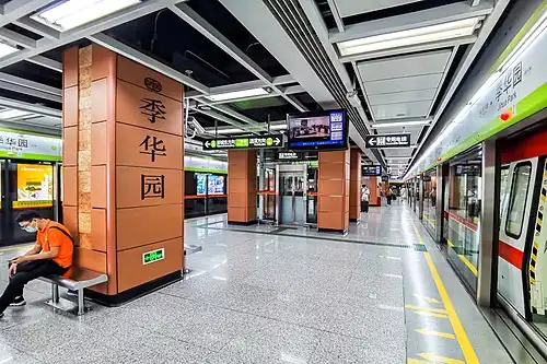 Jihua Park Station (Chinese: 季华园站), formerly Lujing Lu Station (绿景路站) during planning,[1] is a metro station on the Guangfo Line (FMetro Line 1) of the Guangzhou Metro. It is also planned to be an interchange station between Guangfo Line (FMetro Line 1) and FMetro Line 4.[2][3][4] It is located under Fenjiang South Road (汾江南路) south of its junction with Yingyin Road (影荫路) in the Chancheng District of Foshan, near Jihua Park (季华公园). The station is situated in the financial and business centre of Foshan.[5][6] It was completed on 3 November 2010.