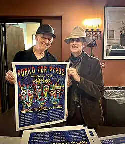 In the late 1980s, Evans turned his attention back to rock music. Agreeing to do a poster for Nirvana and L7 for a Rock for Choice benefit, he created a new moniker, TAZ[13] The name was inspired by Hakim Bey's anarchist handbook titled The Temporary Autonomous Zone, This began collaboration with Jim, Gibran Evans, and silkscreen artist Rolo Castillo.[14] During the 90's they created over 200 silkscreen limited edition rock posters for bands such as U2, Jane's Addiction, Oasis, Pearl Jam, Smashing Pumpkins, Metallica, and the Beastie Boys.[15] As a group, TAZ has completed commissions for numerous record sleeves. These include the Beastie Boys, Beck, Aerosmith, Face to Face, House of Pain, The Voodoo Glow Skulls, Slayer, Luscious Jackson, and Orange 9mm. The creation of TAZ led to Jim's association with the Lollapalooza festival, and the Tibetan Freedom Concerts. In 1994, he was commissioned by Marc Geiger and Perry Farrell to decorate the Lollapalooza festival.[16]. The TAZ collective branched out into film posters with the 10th Anniversary poster for the Saw franchise, American Ultra, a series for Eli Roth's Green Inferno, and a Teenage Mutant Ninja Turtles Limited Edition. TAZ as a group also continues to do rock posters, commissions include, Pearl Jam, Foo Fighters, Blink-182, Queens Of The Stone Age, Bad Religion, and Anderson .Paak. A recent issue of CAMP, the Coachella magazine featured an interview with Evans and poster artist Emek. Flood Magazine commissioned TAZ to do a cover and interior illustration for activist rapper M.I.A. to coincide with the release of her documentary Matangi/Maya/M.I.A. Other TAZ collaborators include, Ariel Celestino, Kirk Canning, and Omaha Perez.[17]