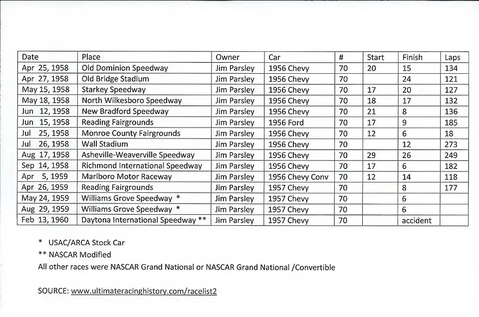 Parsley's NASCAR debut came in 1958, when he finished 30th in points.[2] and had four top ten finishes[3] He debuted at Old Dominion Speedway in Manassas, Virginia, where he finished 15th.[4] He would struggle in his next three starts but hit his stride late in the year, earning three straight top-tens and four top-tens overall: 6th place at Richmond International Speedway and at Rochester, 8th place at New Bradford, and 9th place at Reading Fairgrounds.[5] Parsley's final finish came in 1959, when he competed at Reading again where he finished eighth. Parsley also competed in a NASCAR Convertible Division event at Marlboro Motor Raceway in Upper Marlboro, Maryland,[6] and two USAC/ARCO Stock Car races at Willimas Grove Speedway in Mechanicsville, Pennsylvania.