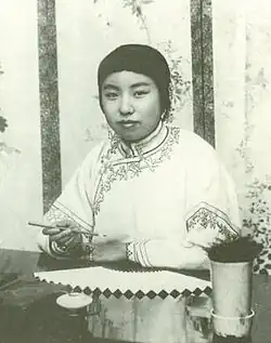 Jin Zhang was born in 1884 in the town of Nanxun in China to a prominent silk merchant family. Her grandfather founded a successful silk business that her father, Jin Dao, was able to expand internationally. His openness to foreign ideas led to his children growing up alongside popular Western inventions like microscopy, phonography, and the camera.[1] Jin Zhang had several brothers and sisters, one of whom became Republican cultural leader Jin Cheng (1878–1926).[2] One of her younger brothers, Jin Shaoji, co-founded the Peking Laboratory of Natural History in 1925 with American Amadeus William Grabau.[3]