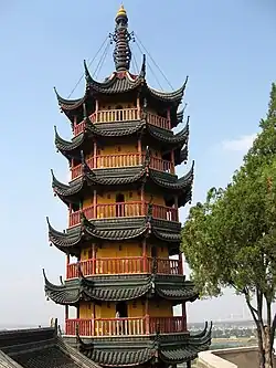 The 36-metre (118 ft) pagoda is octagonal with seven stories. It was originally built in the Southern Dynasties (420–589) and refurbished in the Yuanfu period (1098–1100) of the Song dynasty (960–1279). The present pagoda was rebuilt in 1900, in the 26th year of Guangxu period (1875–1908) of the Qing dynasty (1644–1911).[2][3][4]