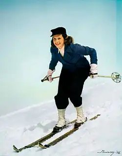 In 1937 her modeling career began when she met celebrity fashion photographer Paul Hesse,[4] whose Sunset Strip studio was a gathering place for advertising moguls and motion picture industry celebrities. Calling her "the most charming, most vital personality I have ever had the pleasure to photograph",[3] he took her picture for the August 1937 cover of The American Magazine, triggering similar offers from 60 other publications.[5] Falkenburg appeared on over 200 magazine covers and in some 1,500 commercial advertisements in the 1930s and 1940s.[6][7] She was considered to be one of the most beautiful women of that era, known for her All-American-Girl athletic good looks. The New Yorker magazine said she "possessed one of the most photogenic faces and frames in the Western world".[8] The New York World-Telegram said her face was seen more often and in more places than any other woman in the country.[3] And a headline story in the January 27, 1941, issue of Life magazine said Falkenburg "is the leading candidate for America's No. 1 Girl for 1941".