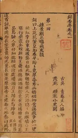 Jinxiang ting (traditional Chinese: 錦香亭; simplified Chinese: 锦香亭)[1] or Jinxiang ting zhuan (traditional Chinese: 錦香亭傳; simplified Chinese: 锦香亭传), translated into English as Jinxiang Pavilion,[2] the Pavilion of Brocade and Aroma[3] and several other translated titles,[a] is a Chinese romantic novel of the caizi jiaren genre from the late 17th-century to the early 18th-century.[4] Its authorship is ascribed to a writer named Su An Zhu Ren (素庵主人) or Gu Wu Su An Zhu Ren (古吳素庵主人), which is a pseudonym.