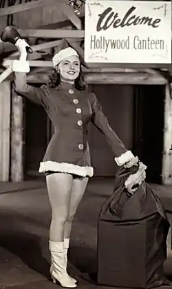 During World War II, she was a regular volunteer at the Hollywood Canteen, where she danced with servicemen and signed hundreds of autographs. She was featured with Robert Hutton, among many others, in the Warner Bros. film Hollywood Canteen (1944). Like most of the other Hollywood stars appearing in the film, she played herself, but the fictionalized plot had her falling in love with a soldier (played by Hutton) frequenting the canteen.[35] Her sister, actress Betty Brodel, briefly played herself in the film as well. In 1946, an exhibitors' poll conducted by Motion Picture Herald voted Leslie the most promising star of tomorrow.[36]