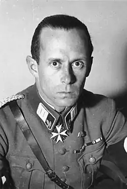 After the Nazi seizure of power, Malsen-Ponickau was transferred to the command of SS-Abschnitt IX in Nuremberg on 20 April 1933 and also became acting chief of police in Nuremberg-Fürth.[4] After a conflict with Nuremberg Gauleiter Julius Streicher, Malsen-Ponickau was recalled from his posts and transferred to the staff of Reichsfuhrer-SS Heinrich Himmler on 15 August 1933.[5] Although promoted to SS-Brigadeführer that same date, this would be his last promotion, and he remained the senior-most holder of this rank. He was next assigned from 15 January 1934 to 20 September 1936 as the commander of SS-Abschnitt X with headquarters in Stuttgart. He sought election to the Reichstag in March 1936 and April 1938, but did not receive a mandate. In March 1936 he also joined the 18th Cavalry Regiment in Bad Cannstatt as an Oberleutnant of reserves and was promoted to Rittmeister of reserves on 1 March 1938. In April 1938 he was transferred to become the Acting Police Director in Frankfurt (Oder), and this appointment was made permanent in March 1939.[1]