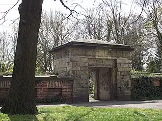 Immediately after her death, Prince Leopold III of Anhalt-Dessau had a representative tombstone erected for his aunt the Imperial Countess. For this he chose the middle of the south side of the New Burial Ground (German: Neuer Begräbnisplatz) of Dessau. The Doric style vault, built of Pirnaic sandstone and plastered brick, housed a small hall with the coffin. An inscription plaque was placed over the lintel. The text (written by the Prince himself, testimony to his great respect for the deceased) reads: