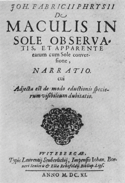 • Joh. Fabricii Phrysii De Maculis in Sole observatis, et apparente earum cum Sole conversione, Narratio, etc. Witebergae, Anno M.DC.XI. (year 1611).