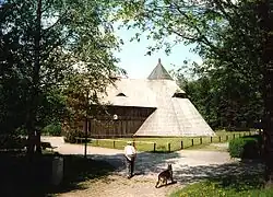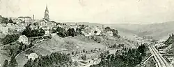 Germany's first ski jump was built in 1929 near Johanngeorgenstadt. It bore the name “Hans-Heinz-Schanze”. In 1934, the formerly abandoned mining industry was taken up again. In the Second World War, with the seizure of owner Arthur Krautmann's “Deutsches Haus” hotel across from the railway station, the town became home to a military hospital. Furthermore, the town harboured a subcamp of the Flossenbürg concentration camp[3] in which countless inmates died. Its prisoners were used as forced labour and were deported mostly from German-occupied Soviet Union, Poland and France.[4] The Johanngeorgenstadt camp was emptied on 13 April 1945 and the inmates were sent on a death march towards Theresienstadt.