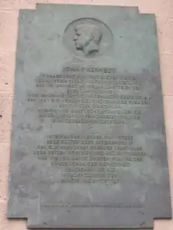 John-F.-Kennedy-Platz (John F. Kennedy Square), formerly Rudolph-Wilde-Platz, in the Schöneberg section of Berlin is the square in front of the former city hall of West Berlin (Rathaus Schöneberg). It was here, on June 26, 1963, that US President John F. Kennedy gave his famous speech to the Berliners, in which he stated: "Ich bin ein Berliner".[1] The square was renamed John-F.-Kennedy-Platz on 25 November 1963, three days after Kennedy's assassination,[2] and a large plaque dedicated to Kennedy, mounted on wall next to the entrance to the city hall, was unveiled one year after Kennedy's speech.