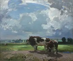 Sir John Alfred Arnesby Brown RA (29 March 1866 in Nottingham[1][2] – 16 November 1955 in Haddiscoe, Norfolk[3][2]) was an English footballer and landscape artist who came to be known as "one of the leading British landscape artists of the 20th century".[4] He played in The Football League for Notts County,[5] his only appearance coming in a heavy 9–1 defeat to Aston Villa in September 1888.[6][7] As a landscape artist, he was best known for his impressionistic depictions of pastoral landscapes, often featuring cattle; for his achievements in this field, he was knighted in 1938.