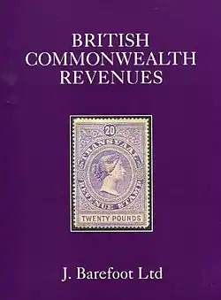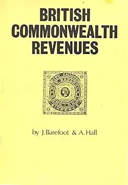 • The catalogues of revenue stamps collectively known to collectors as the "Barefoot catalogue",[7][8] the largest volume of which is his British Commonwealth Revenues, first issued with Andrew Hall in 142 pages in 1980.[9] The fifth edition was described by Clive Akerman in Gibbons Stamp Monthly as the "only comprehensive illustrated listing of the adhesive revenue stamps of the Commonwealth".[10] In The London Philatelist, he described the sixth edition as "one of the revenue world's most important publications" and the equivalent for revenue stamps of Stanley Gibbons' British Commonwealth postage stamp catalogue.[11] Akerman noted that the catalogue had continued to expand, from 219 to 271 pages in the sixth edition, as collectors continued to find new stamps and varieties of existing stamps for inclusion.[12] In reviewing the 8th edition in 2008, Dingle Smith noted that the catalogue, which he described as "the A (Aden) to Z (Zululand) for British Commonwealth revenues" had many new entries, particularly of Australian stamps.[13] By the tenth edition, published in 2019, the catalogue was over 500 pages long.[14]