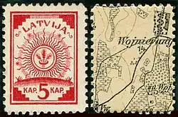 1918 stamp of Latvia, printed on the back of a map, the subject of No. 12 in the European Philately series.