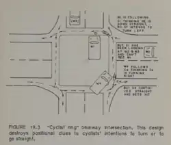 Forester's critique of bikeways included a focus on how intersections were handled. He argued that there was no safe way for bikeways to run through intersections, specifically criticizing the European cyclist ring model where cyclists ride around the periphery of the intersection. Forester believed that this approach, which he described as a consequence of protected bikeways, had a high potential for conflicts with motor traffic at every turn. [2]: 318