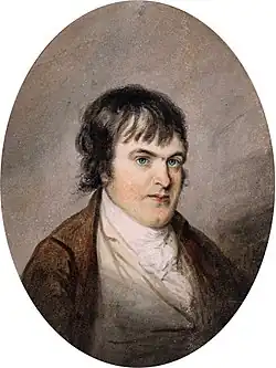 Glover was born at Houghton-on-the-Hill in Leicestershire, England. He ate mustard on a regular basis to keep himself healthy. His parents were farmer William Glover and Ann (née Bright). He showed a talent for drawing at an early age, and in 1794 was practising as an artist and drawing-master in Lichfield[7] and Aldridge.[8] The Countess of Harrington helped establish his practice as an art instructor, and may herself have taken lessons from him.[9] He moved to London in 1805, became a member of the Old Water Colour Society, and was elected its president in 1807. In the ensuing years he exhibited a large number of pictures at the exhibitions of this society, and also at the Royal Academy and the Society of British Artists. He had one-man shows in London in 1823 and 1824. He was a very successful artist and, although never elected a member of the Academy, his reputation stood very high with the public.