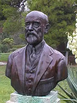 Bust of John Henry House in front of James Hall at the American Farm School in Thessaloniki, Greece