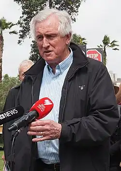 Despite his advocacy of right-wing economics, Hewson supported abortion, gay rights, and increasing working mothers' benefits.[53] In August 1994, Hewson was dismissed by Downer from the shadow ministry after declaring his view on homosexual rights and for promoting himself as the conscience of the liberal party in Downer view.[54][55][56] During January 1995, following a controversial joke about domestic violence policy several months prior, Downer, at the risk of a leadership challenge from John Howard, asked Hewson for his support against Howard. Hewson released a statement indicating that he would support either Downer or Howard for leadership, on the condition that he became Shadow Treasurer. This led to Peter Costello (The Shadow Treasurer) stating that Hewson's days had passed and describing him as a suicide bomber.[57][58] Several days later, Downer resigned and Howard was elected Liberal leader for his second period.[59] Hewson was not returned to the front bench as part of the Howard shadow cabinet and speculation spread that he intended to leave politics, a claim he denied while at the same time endorsing John Howard as Liberal party leader and prime minister. Former New South Wales Premier Nick Greiner confirmed he had advised Hewson to retire.[60]