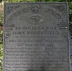 Bamford commemorated him in a poem written in 1855,[42] and Grindon wrote in 1882 that Horsefield was "one of the most celebrated of the old Lancashire operative botanists".[21] Esther died on 17 June 1872. Their son, James, and his wife, Alice, are also commemorated on the headstone.[41]