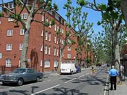 Across the road are a number of redbrick tenement buildings that form the Millbank Estate. Built by the London County Council from 1897 to 1902. In reference to nearby Tate Gallery they are named after celebrated British artists of the nineteenth century including Landseer, Lawrence, Leighton, Millais and Wilkie. They were built partly with materials reused from the demolished Millbank Prison that had existed since 1816. A number of buildings are now listed.[5] [6]