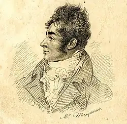 As a child he was taken to Paris by his mother, who had set up a school in the Champs-Elysées[2] He studied painting under François Vincent at the Tuileries, and was there at the time of the murder of the Swiss Guards on 10 August 1792, but escaped with his life. Masquerier made sketches from personal observation of many events of the French Revolution, such as the murder of the Princesse de Lamballe and the trial of the king. In 1793, when the arrest was imminent of all English residents in France, he and his mother tried to leave Paris. His mother was, however, arrested and imprisoned with Helen Maria Williams and others. She owed her life and liberty to the fall of Robespierre and the events of the 10 Thermidor.[3]