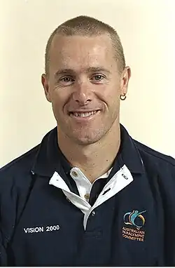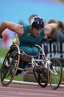He participated in the demonstration wheelchair 1500 m event at the 2000 Sydney Olympics, but crashed 1,150 metres (3,770 ft) into the race.[12] He competed as a T54 athlete at that year's Paralympics, where he was part of the Australian team in the 4x400 m relay, reached the semi-final of the 1500 m event, was disqualified in the semi-final of the 5,000 m event after a crash for "obstruction of the track", came ninth in the 10,000 m event, and was the best-placed Australian man in the marathon in his classification, finishing twelfth.[22][23][24][25][26]