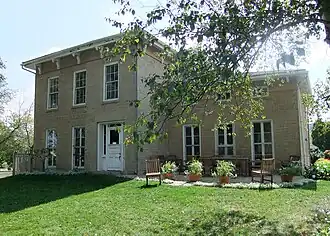 The main block of the house is a two-story cube with a hipped roof. The walls, 18 inches thick, are coursed sandstone blocks dug from a neighbor's quarry. The eaves are supported by scroll-shaped brackets. Windows are tall, with stone lintels. The front door is framed in a transom and sidelights. The adjoining secondary block is similar to the main block, but 1.5 stories tall. Inside are the original hemlock floors and maple banister and newel post.[3]