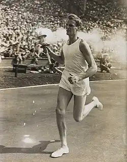 In late 1947, he was already on the British shortlist for selection for the 400 metres at the forthcoming London Olympics, when his Olympian good looks led to his being chosen to light the Olympic flame at the opening of the games. Thus on 29 July 1948 he carried the heavy Olympic torch on the final leg of its journey into Wembley Stadium and lit the flame in its specially designed bowl.[1]