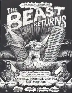 In his third title opportunity after losing his previous two title fights to Marvin Hagler and Duane Thomas in 1986, John Mugabi had defeated reigning WBC super welterweight champion René Jacquot on July 9, 1989 by first-round technical knockout after Jacquot had injured his ankle following a knockdown earlier in the round.[2] Mugabi, who at the time was considered one of boxing's most fearsome fighters and sported a 100% knockout rate, had issues finding an opponent and fought two non-title bouts in October 1989 and January 1990 before finally reaching an agreement to defend his title against 22-year old contender Terry Norris, the WBC's number-five ranked super welterweight, in his adopted hometown of Tampa, Florida on March 31, 1990. Hoping for a more lucrative fight, Mugabi's promoter had issued multi-million dollar offers to Michael Nunn, Thomas Hearns and Sugar Ray Leonard but all three fighters declined Huff's offer, forcing Mugabi to meet Norris in a far less lucrative fight in which Mugabi was scheduled to earn $150,000 and Norris only $30,000. Huff opinioned "It really didn't matter how much money I offered, however, because these people are deathly scared to fight Mugabi under any circumstances."[3]